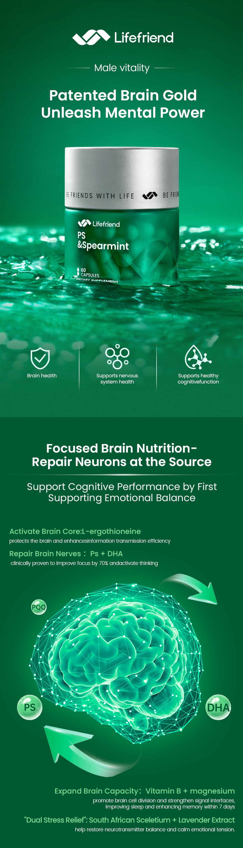 成分磷脂酰丝氨酸、柠檬酸镁、二十二碳六烯酸(DHA)、留兰香提取物、南非醉茄提取物、L - 麦角硫因、吡咯喹啉醌(PQQ)、硫胺素(维生素 B1)、核黄素(维生素 B2)、维生素 B6、维生素 B12。